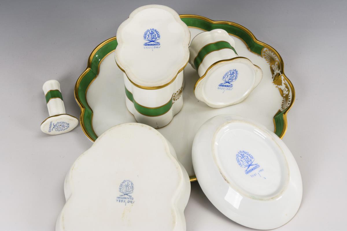 6 parts. Multipass shape with green ribbon and gold ornamental pattern. Tray (Ø 17.5 cm), six-pass oval bowl (L 13.5 cm), oval bowl (L 10 cm), pen vessel (H 5.5 cm), candlestick (H 5 cm) and petschaft (L 4.5 cm). Small paint chip on the edge of the small oval bowl.