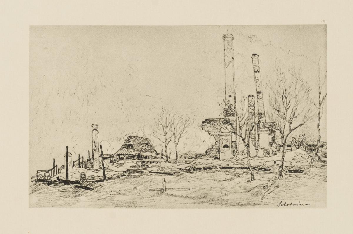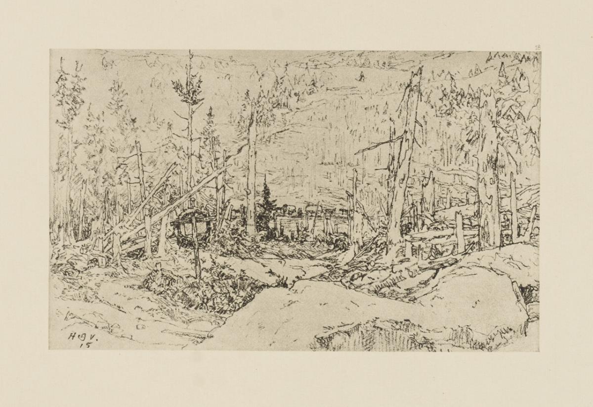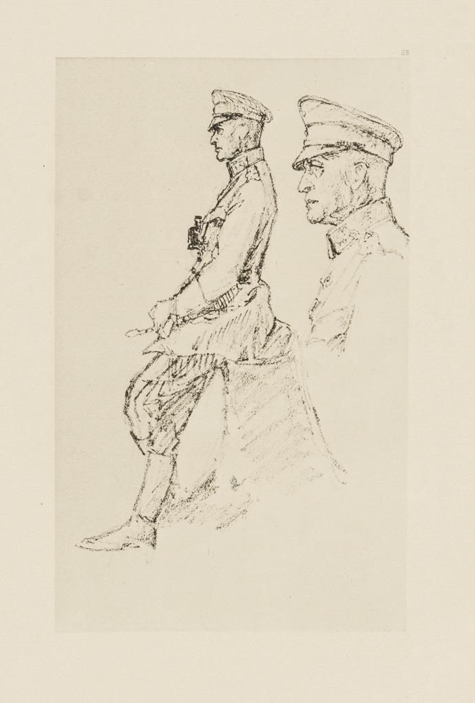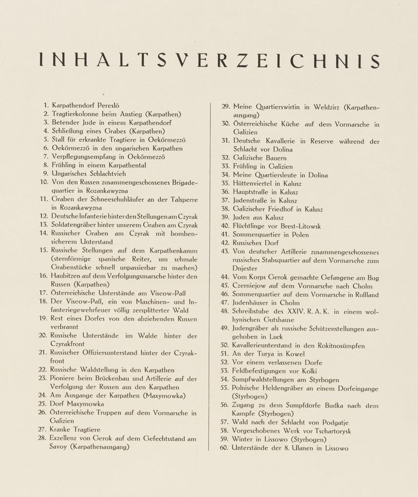 Complete portfolio with 60 collotype prints after drawings from the war area Carpathians, Galicia-Poland and Russia with title and table of contents, published by the National Publishing House, Charlottenburg/Berlin 1916; for the benefit of the National Foundation for the survivors of those killed in the war. Folder stained, title page with light damage, collotype prints at the edges partly with foxing.
