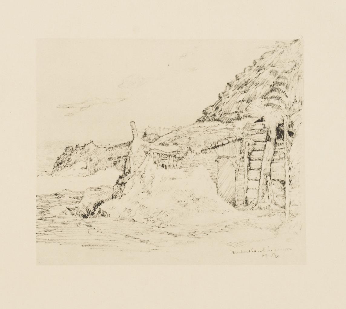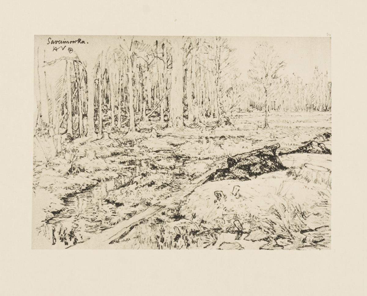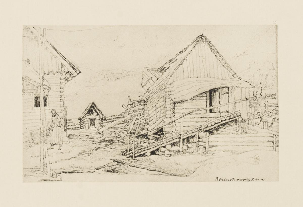 Complete portfolio with 60 collotype prints after drawings from the war area Carpathians, Galicia-Poland and Russia with title and table of contents, published by the National Publishing House, Charlottenburg/Berlin 1916; for the benefit of the National Foundation for the survivors of those killed in the war. Folder stained, title page with light damage, collotype prints at the edges partly with foxing.