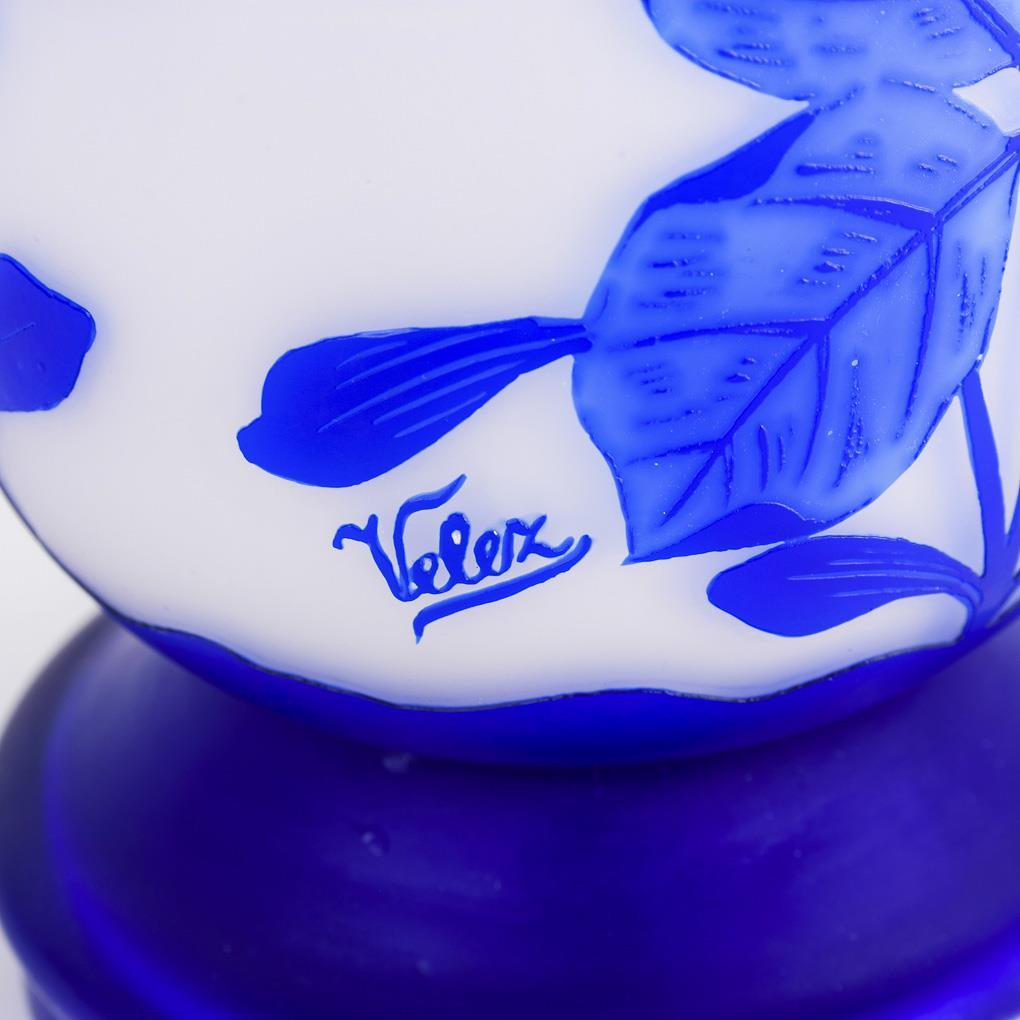 White opal glass, cobalt blue overlay, frosted. H 23.5 cm.