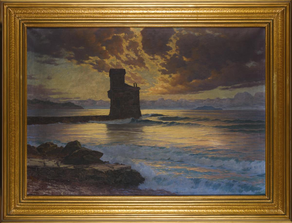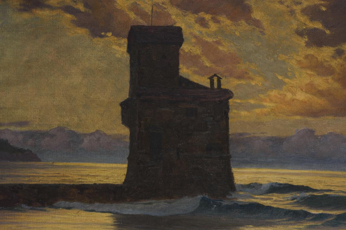 Atmospheric evening light over the coast with castle or lighthouse. 1 back-taped tear 2 cm, without retouching.