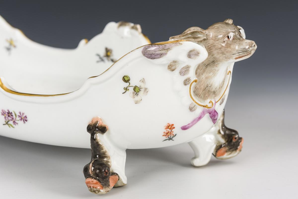 Dish as presentoir for vinegar/oil jug, originally part of a baroque plat de ménage. Oval bowl with matching curved rim, four dog head handles and four dolphin feet. Polychrome painted with small floral bouquets and scattered florets, in the bottom two holes for the metal mounting of a holder for decanters, the remaining holes probably pierced ash dots. Underneath chip and partly chips at the drilled holes, 1 dog's ear bumped, fire crack at 1 dolphin foot.