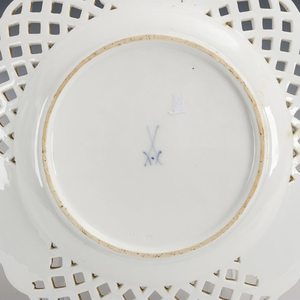 Plate with basket structure and basket openwork flag. In the mirror and in three rocaille cartouches painted floral bouquets.