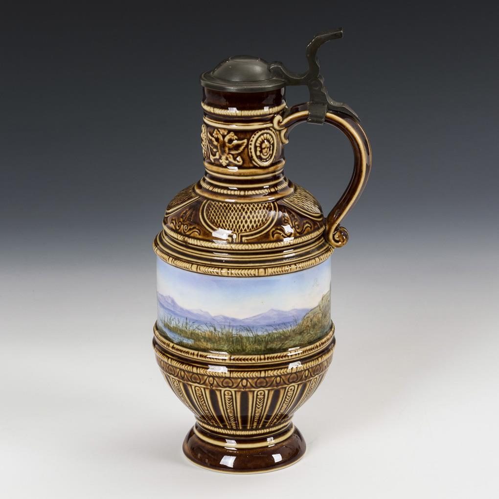 Underglaze brown patterned ground, surrounding a polychrome painted landscape with stag: pewter mounted hinged lid. H 28.5 cm.