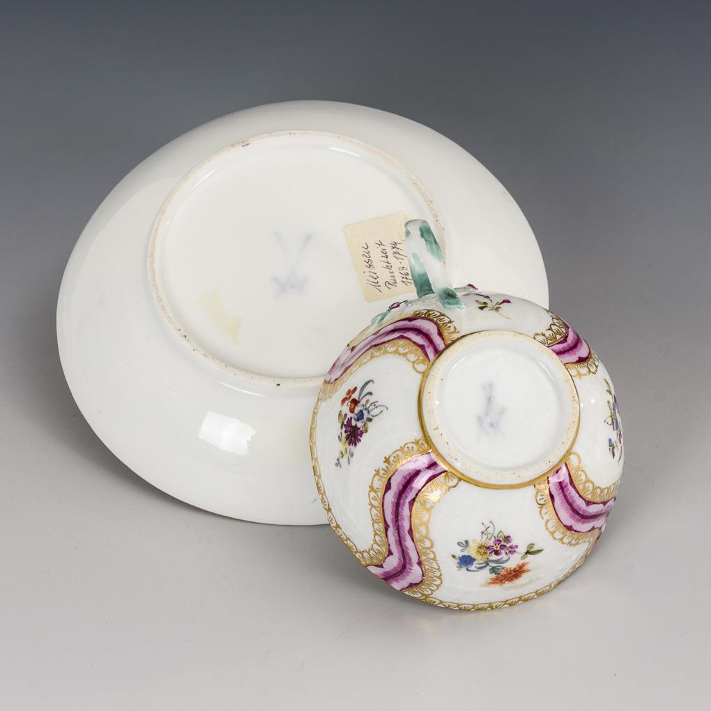 Form "Neuozier". Bellied tase with branch handle. Between purple curved stripes with gold lace small floral bouquets and scattered flowers. Partial gold rubbing.