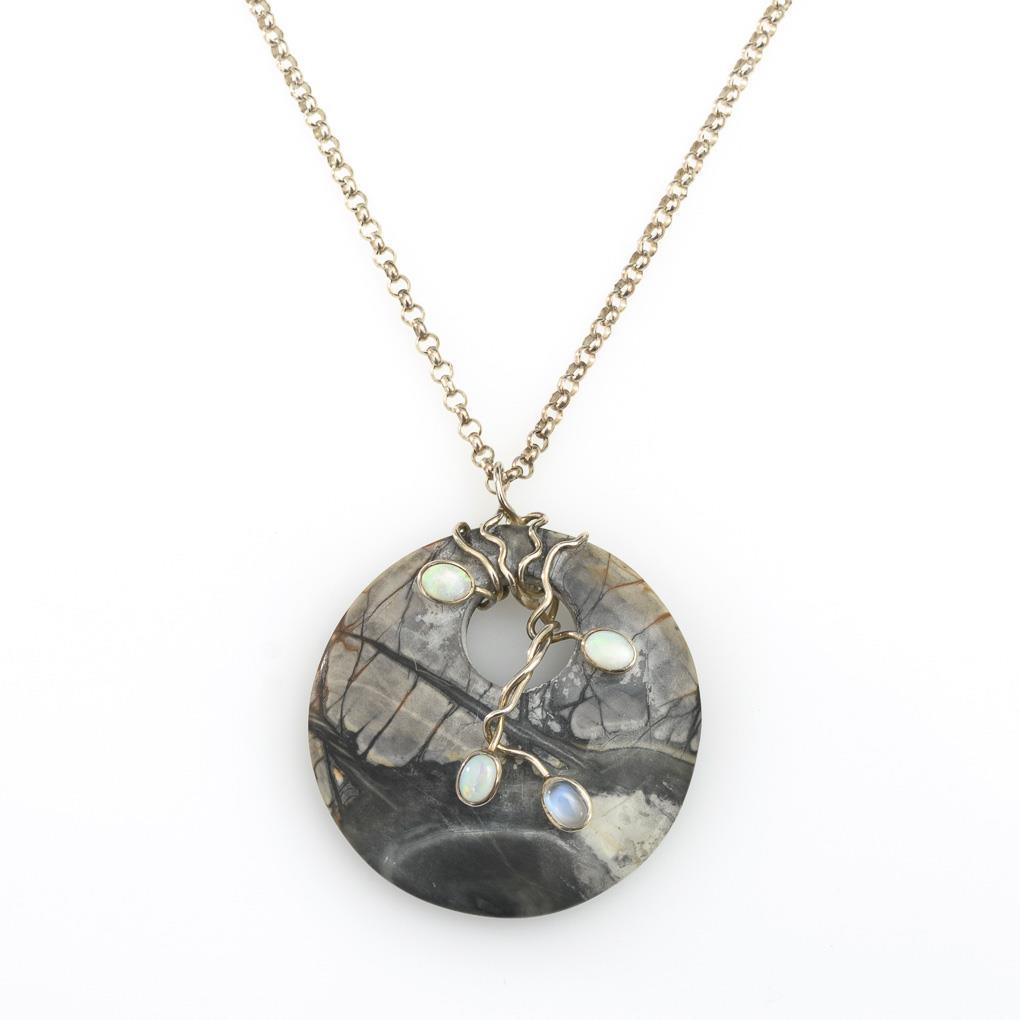 Picasso stone with mounted bezel-set opal cabochons and moonstone cabochon on pea chain with lobster clasp.