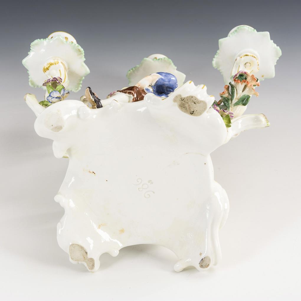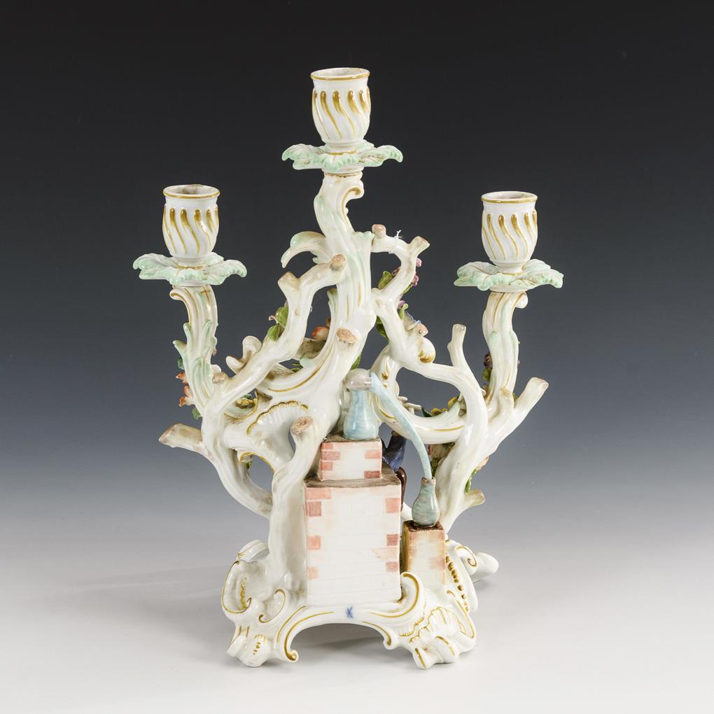 Three-flame candelabrum with floral coating, on the rocaille foot a man with money bag sitting.