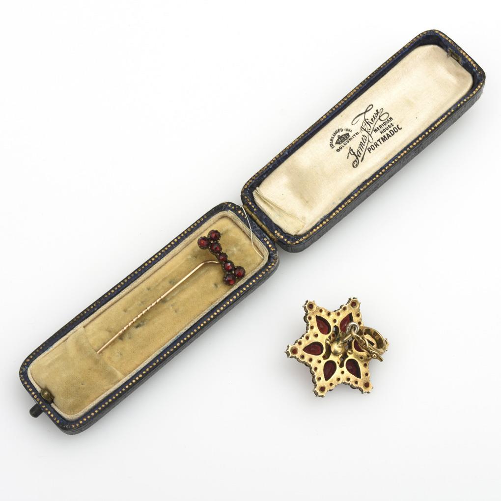 Pendant (former brooch) with clip eye. Garnet pin head on long needle.