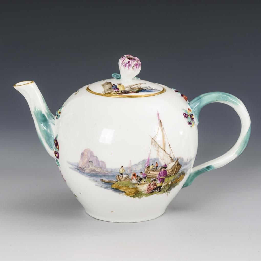 Sphere-bellied jug with branch handle and finial and flower knob lid. On both sides finely painted coastal landscapes with merchants and goods. Restored, flower knob bumped.