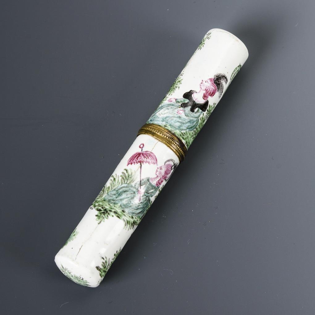 On the body and lid each lady with cavalier in an indicated park. Enamel somewhat hair-cracked, partly slightly retouched.
