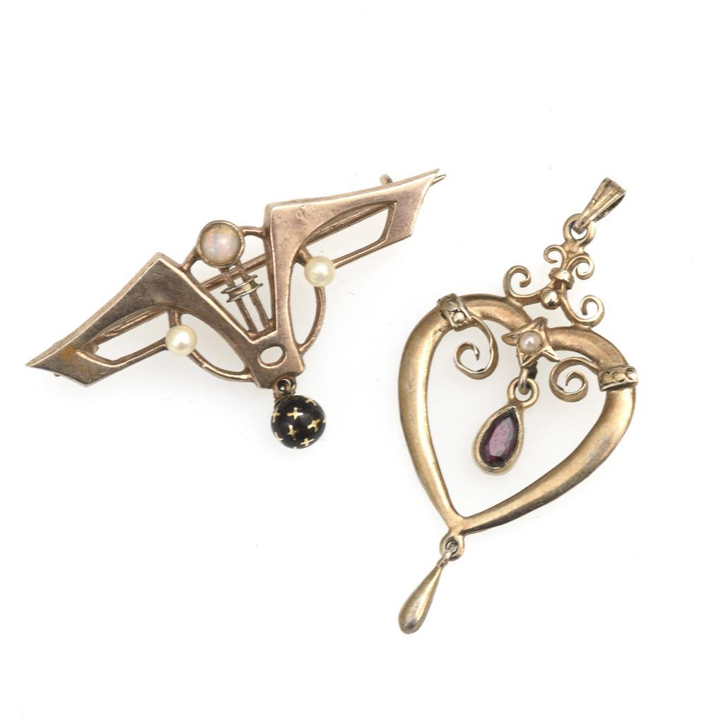 Style brooch and heart pendant with opal cabochon and small pearls. Hook clasp.