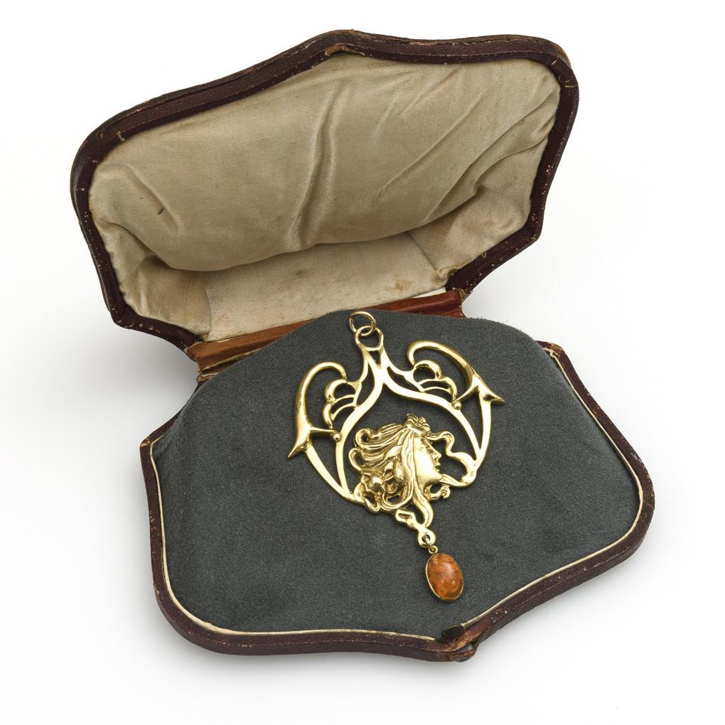 Yellow gold 585 stamped. 6 x 8 cm. Case 14 x 11 x 5 cm. 24,7 g.