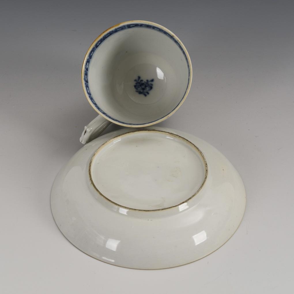 Underglaze blue painting and polychrome onglaze painting, brown rims, gold decoration. H cup 7 cm, Ø saucer 13.5 cm.