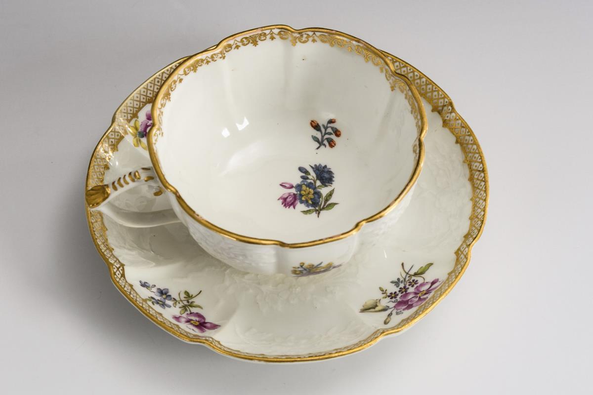 Polychrome painted, gold decorated. H cup 5 cm, Ø original saucer 13.5 cm.
