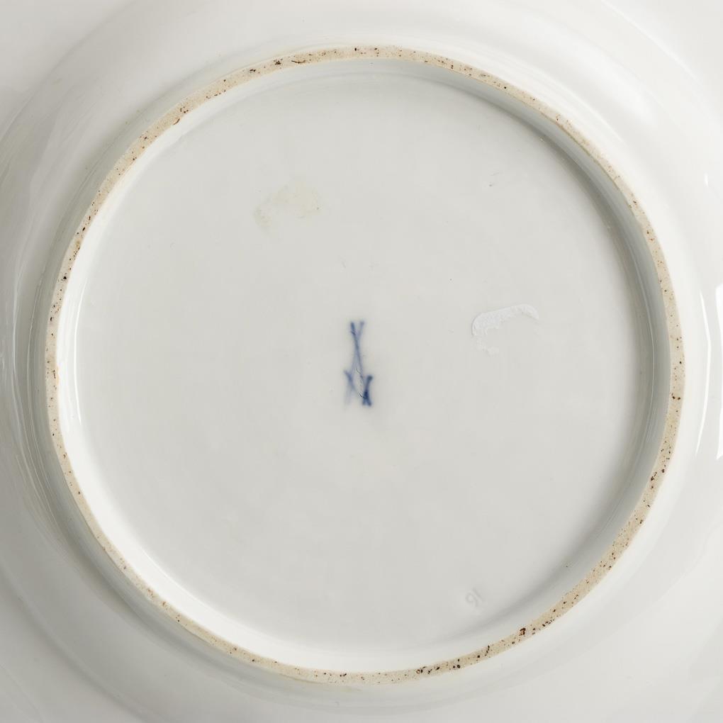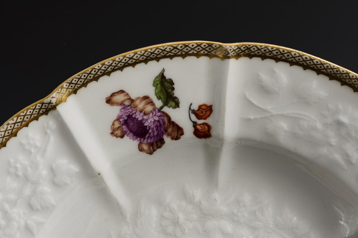 Dinner plate with the relief decoration "Gotzkowsky". In the mirror a finely painted bouquet of flowers with rose, on the flag various flower stems. Minimal gold abrasion.