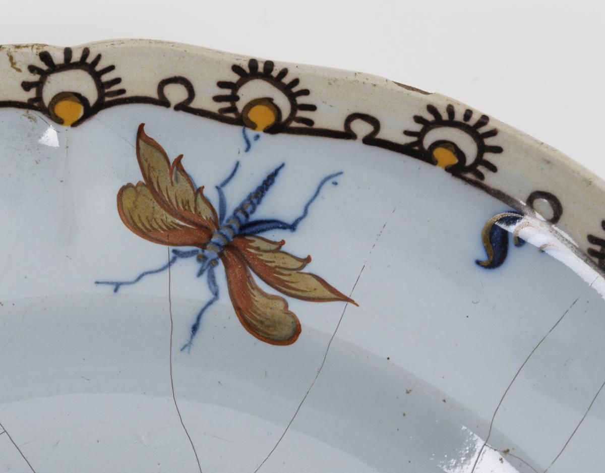 Round plate with curved rim. In the mirror an Asiatic figure depiction surrounded by an insect and floral decor. Imitated (incised) glaze cracks. Partial bumps.