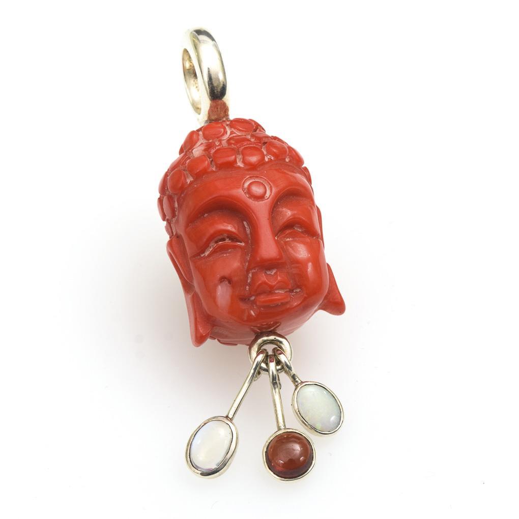 Buddhist head pendant bamboo coral with moonstone, opal and tourmaline.