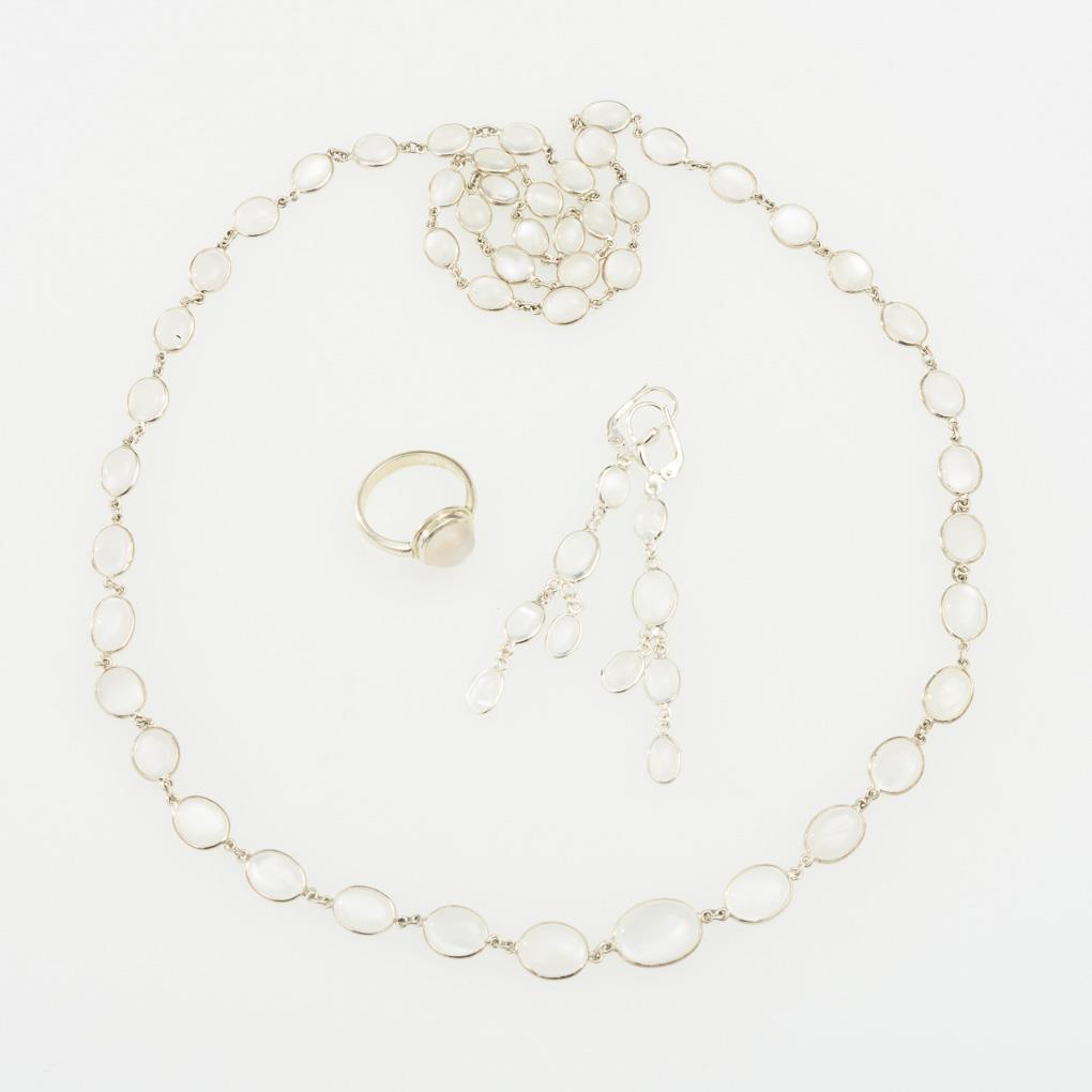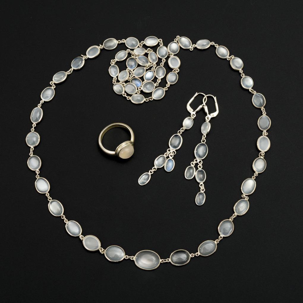 Continuous necklace, pair of earrings and ring with casket-set moonstone cabochons.