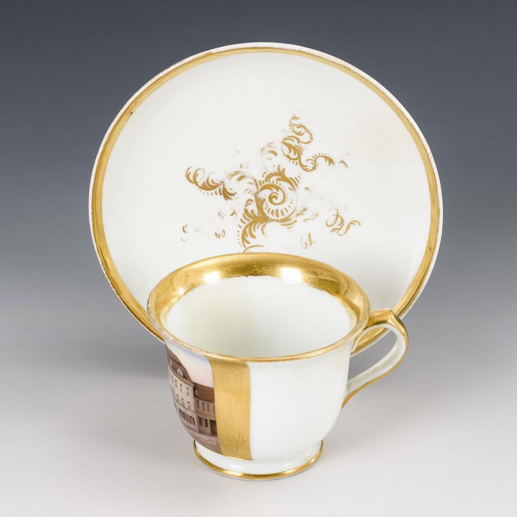 Bell cup with ear handle. On the front a gold-framed rectangular cartouche with a view of a house. Cup with rim restoration, saucer with gold abrasion.
