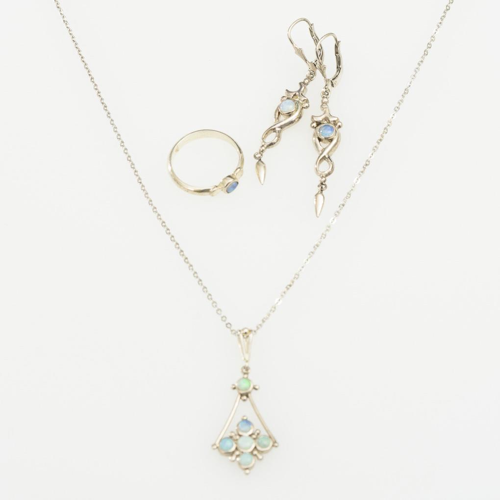 Pendant, ring and pair of earrings with small opal cabochons. Anchor chain with ring spring clasp. Spring bail.