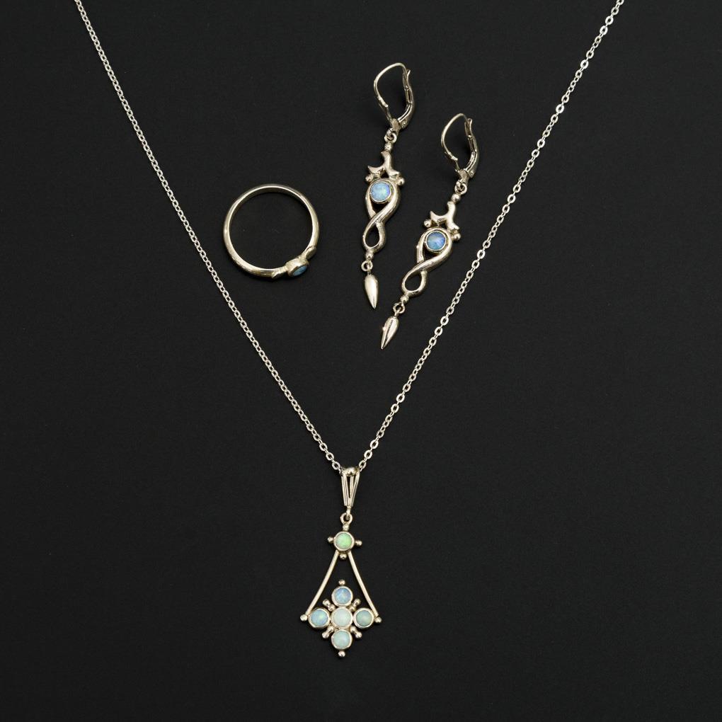 Pendant, ring and pair of earrings with small opal cabochons. Anchor chain with ring spring clasp. Spring bail.