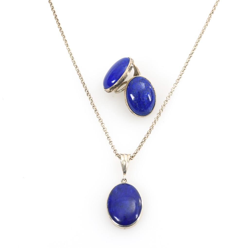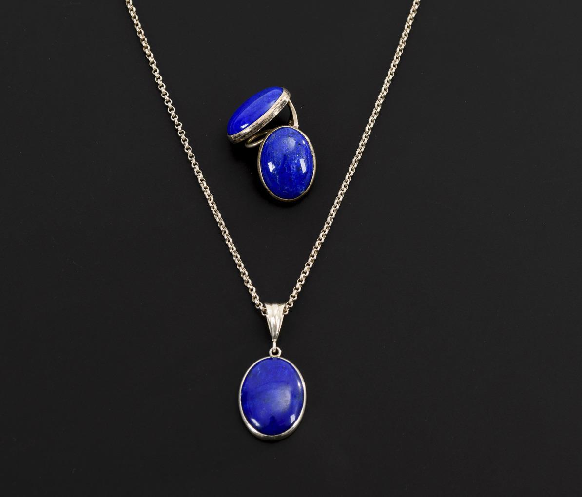 Lapiscabochons in closed bezel settings. Heir chain with lobster clasp. Clip mechanism.