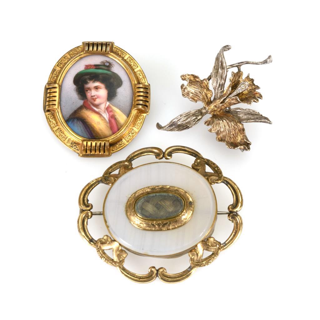 Farbig gemalte Miniatur in verzierter Zargenfassung. Plastische Orchideen-Blüte. Achattafel mit verglaster Haareinlage in reliefiertem Rahmen. Kugelhaken, Hakenverschluss.