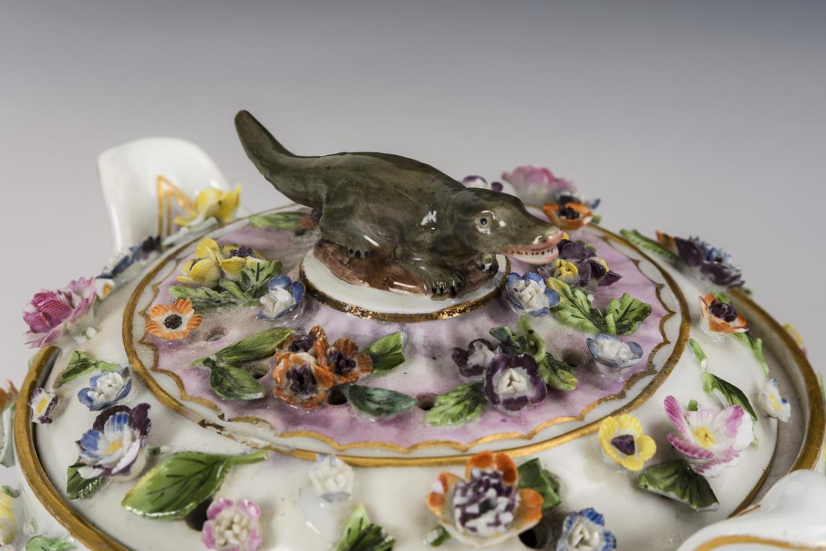 Curved box with two handles, rich floral decoration and the plastic figure of a crocodile as a knob. Lining bumped, lid restored.