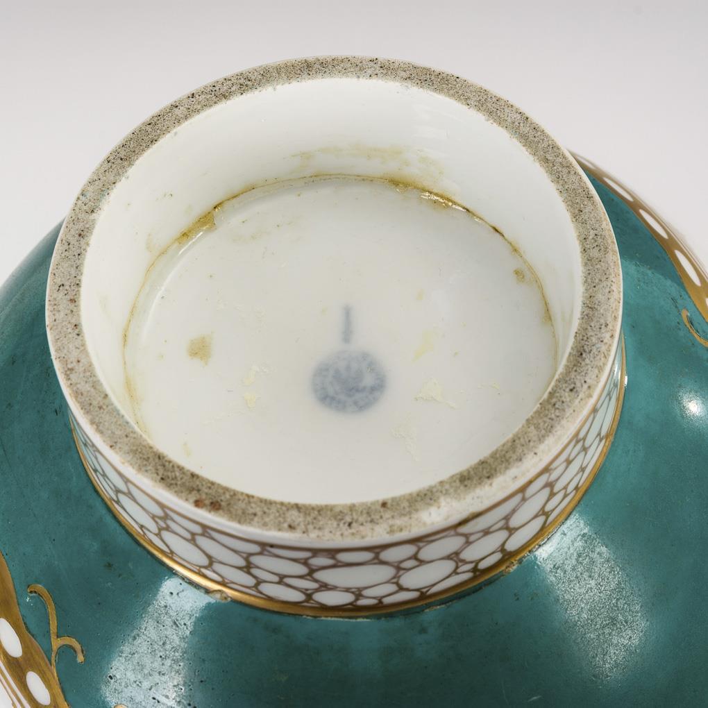 Pumpkin vase with turquoise background. Gold rocaille-framed cartouches on both sides depicting gallant scenes. Gold rubbed, cylinder stand ring glued, restoration at mouth rim.