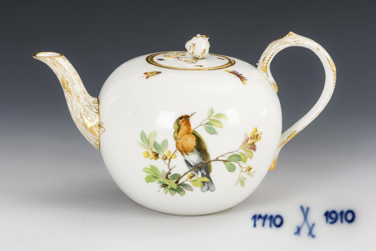Form "Altozier". Painting on both sides of a bird on a branch as well as insects. Bump on the inner rim as well as the rose finial.