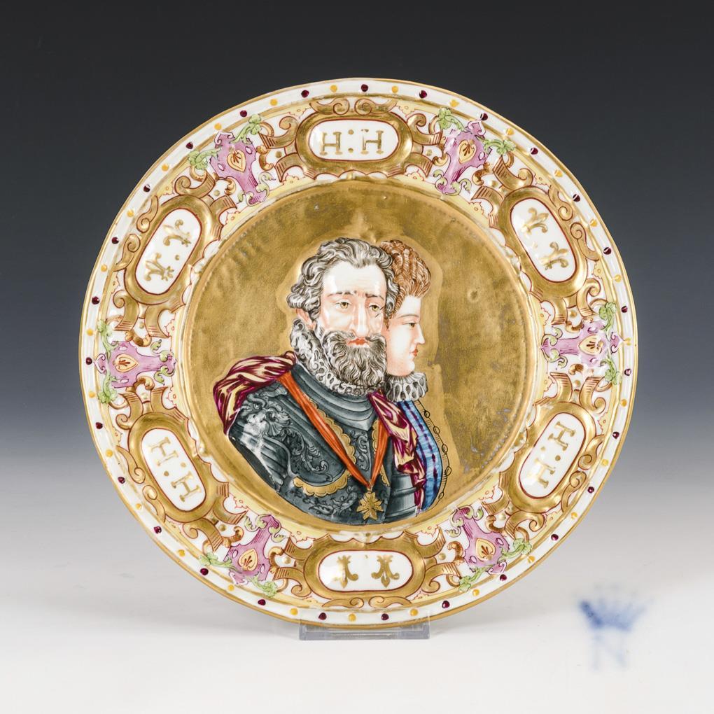 Plate with the relief double portrait of a gentleman and a lady, on the flag alternating oval cartouches with lilies and the letters "H:H". Minimal gold abrasion.