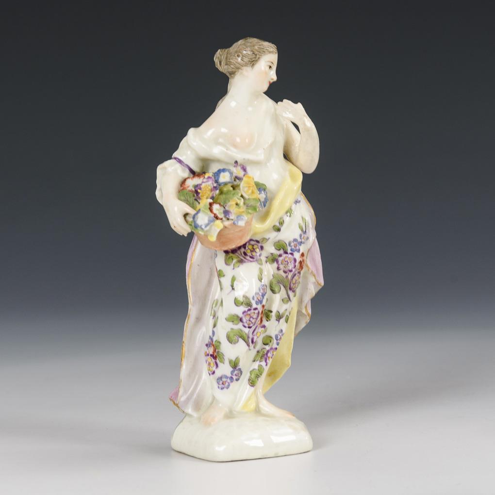 Standing young woman, carrying a basket of flowers. Underneath minimal bumping on base, bumping on flowers and fingers, left arm restored, gold rubbed.