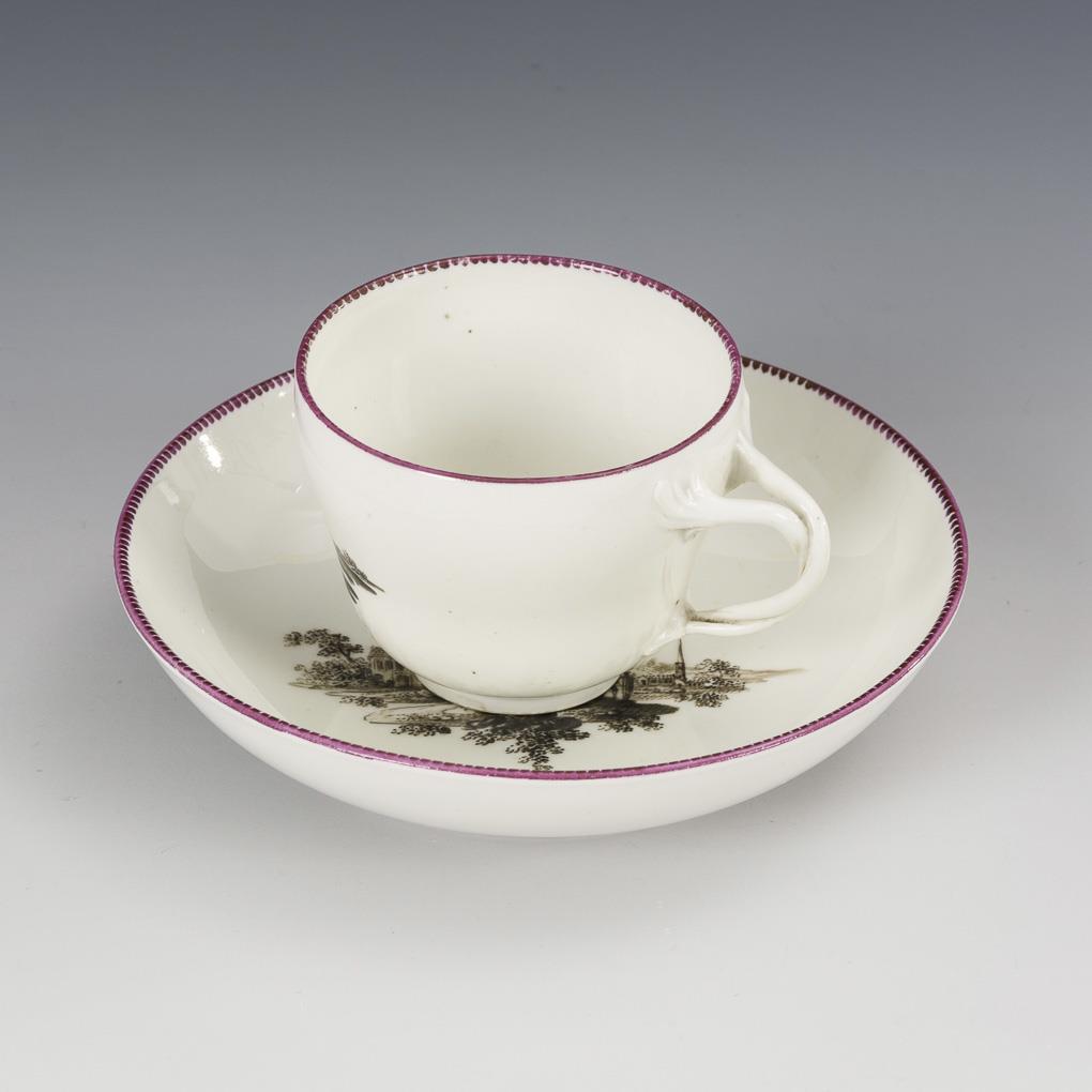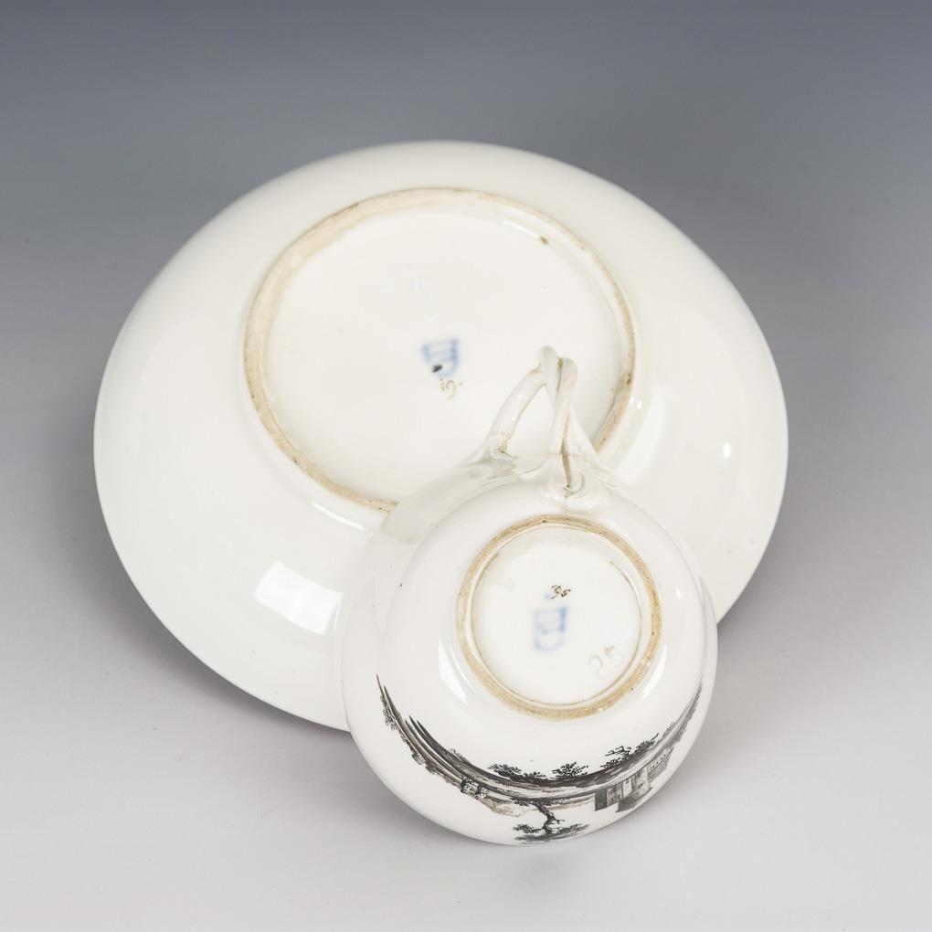 Bell cup with twisted handle. On the front of the cup as well as in the mirror of the saucer the depiction of a landscape with architecture. Hairline crack in the handle.