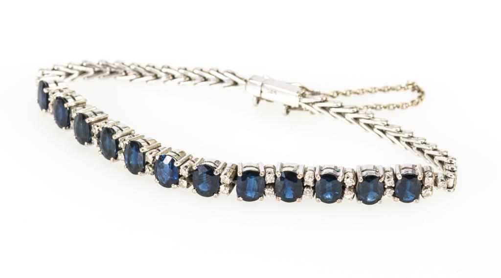 12 Saphire und 26 kleine Diamanten zwischen Fuchsschwanzkette. Kastenschloss mit Achtersicherung und Sicherheitskette.