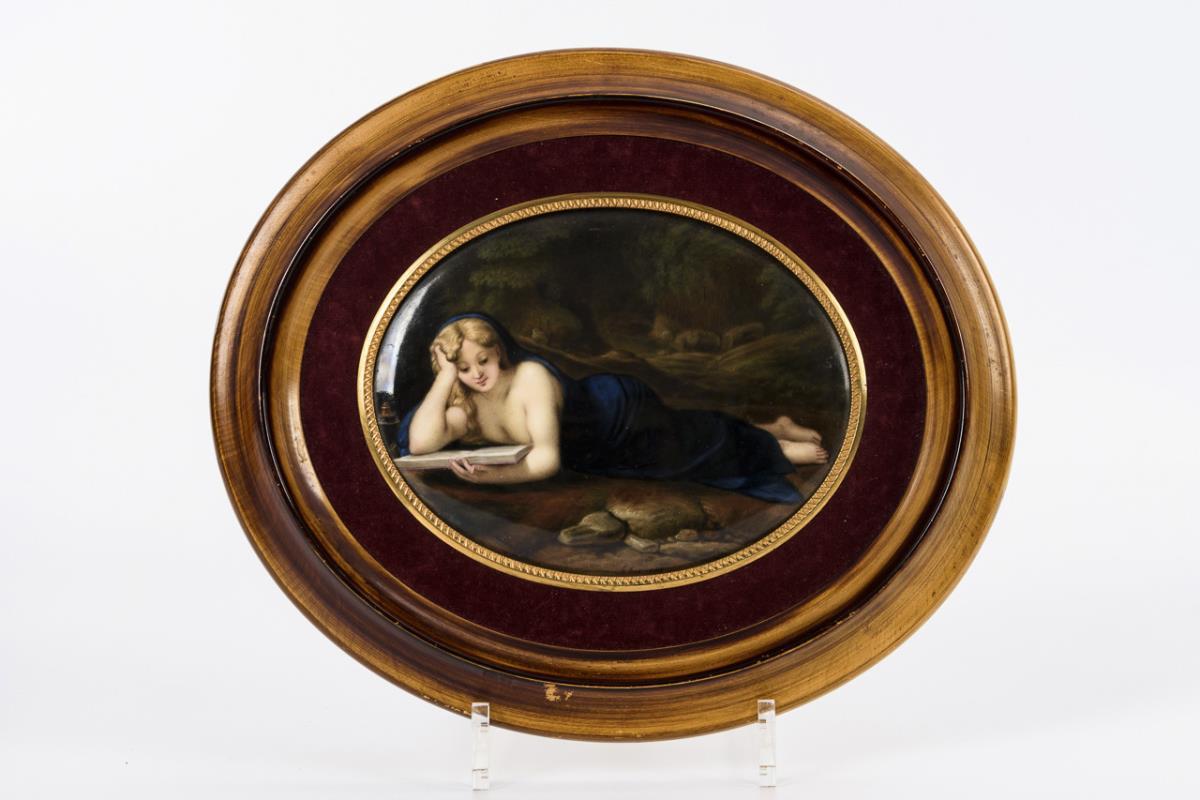Oval plate depicting Mary Magdalene lying in a landscape with book and anointing box.
