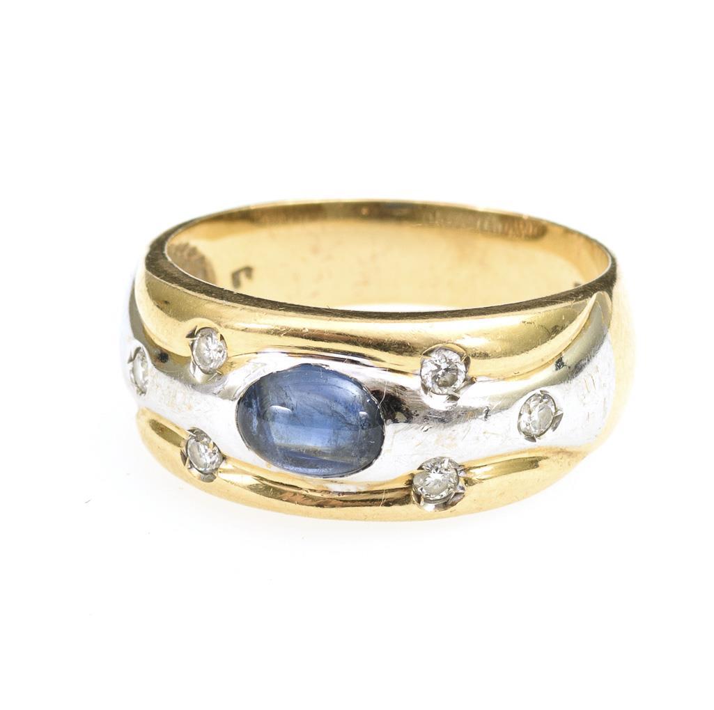 Wide band ring with sapphire cabochon and 6 small inset diamonds.