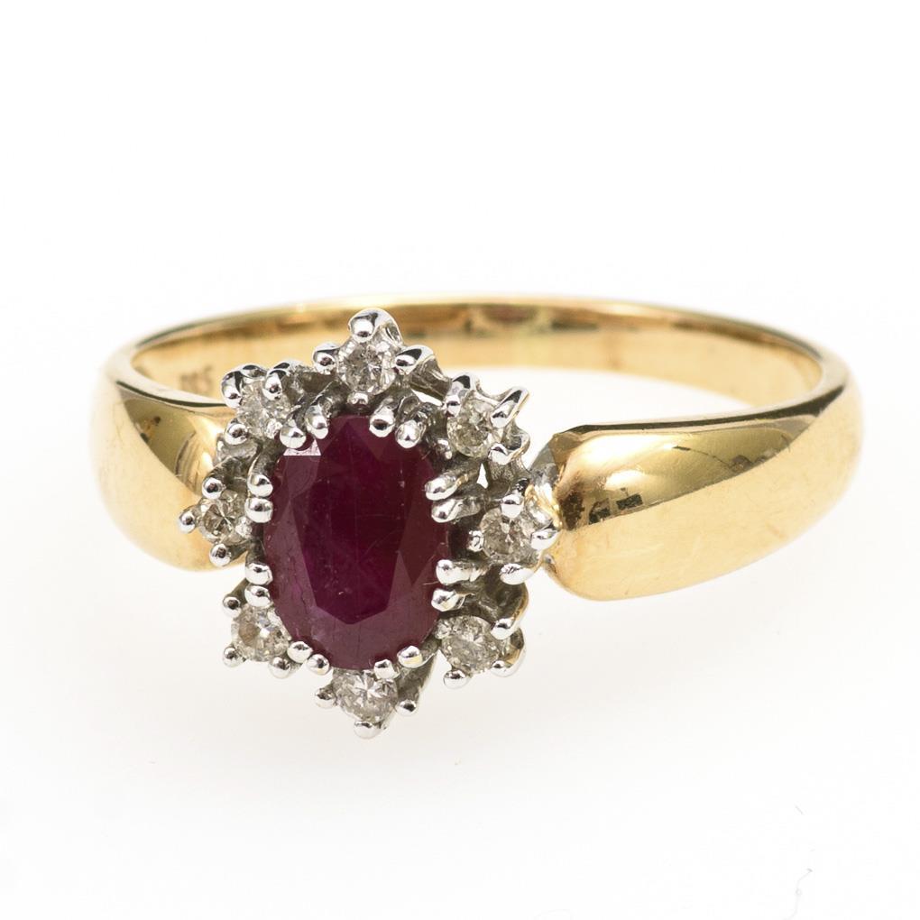 Chaton set ruby surrounded by 8 small diamonds, between center rail.