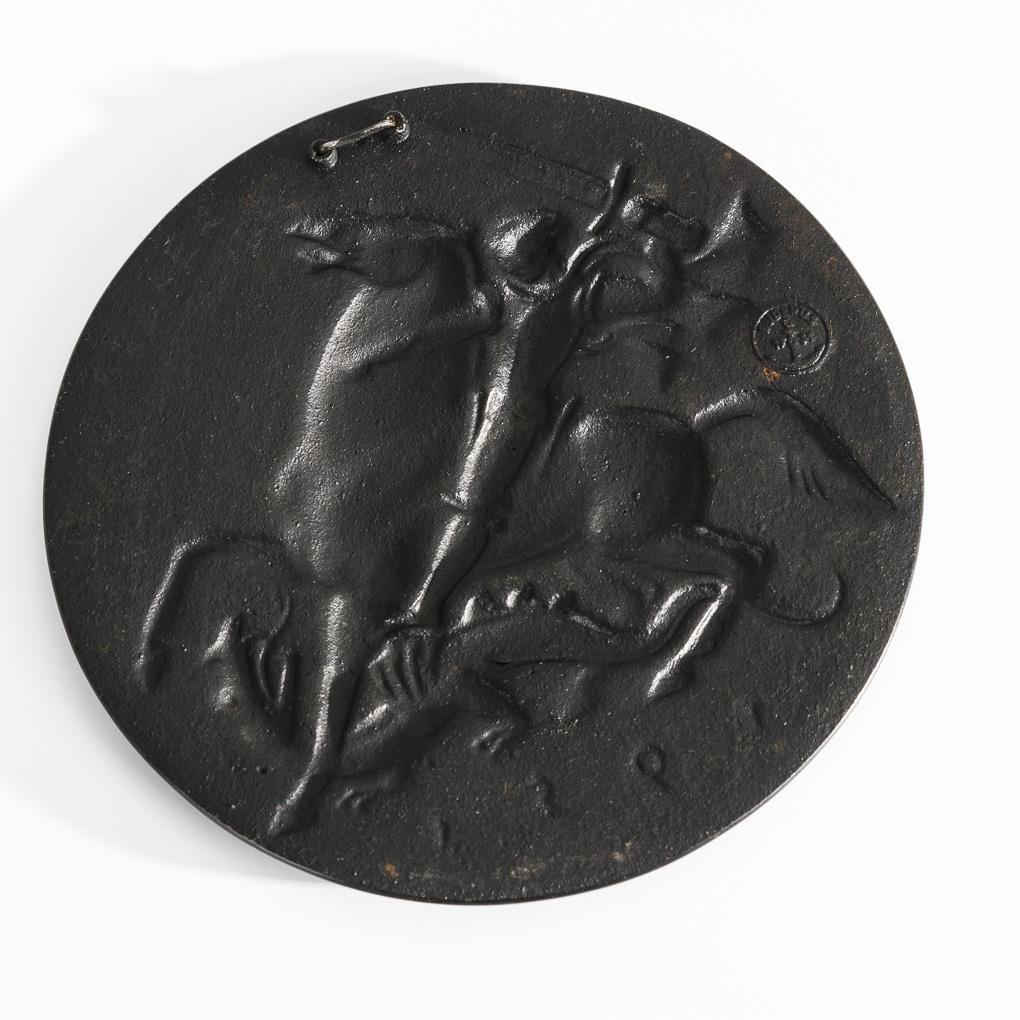 Iron cast blackened, verso hanger. "1953". Foundry mark on verso. Ø 14 cm.