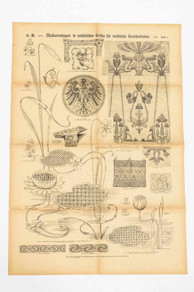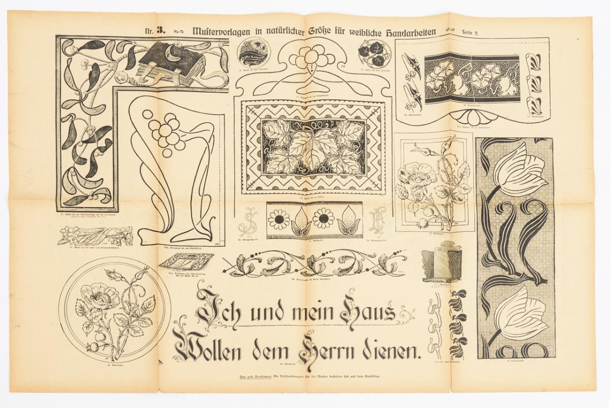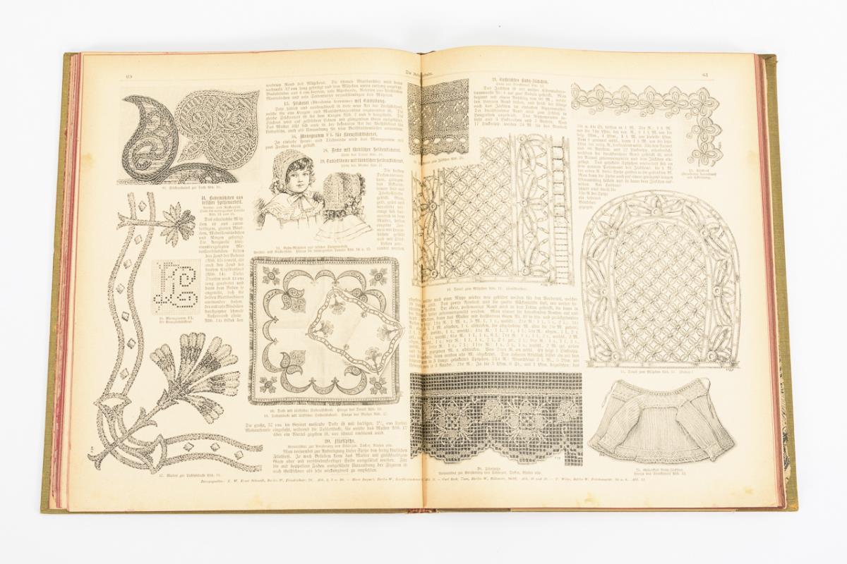 "Containing colored original patterns for canvas embroidery, appliqué, and satin stitch, as well as patterns for knitting, crochet, Irish lace, filet, weaving, Hardanger, Tenerife, tying, bobbin lace, cross stitch, and embroidery of all kinds, and a guidebook for kitchen and home." Bound volume with enclosed pattern sheets.