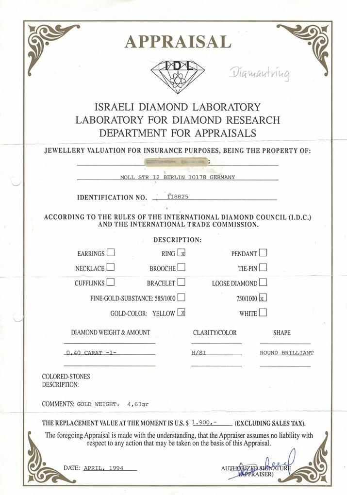 Yellow gold 750 stamped. Diamond 0.40 ct/H/si. Ring size 55. 4.5 g.