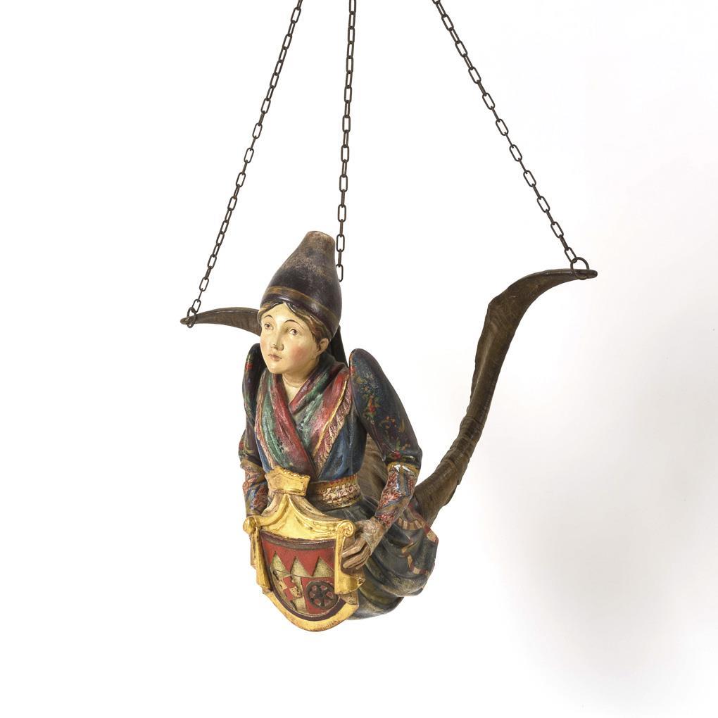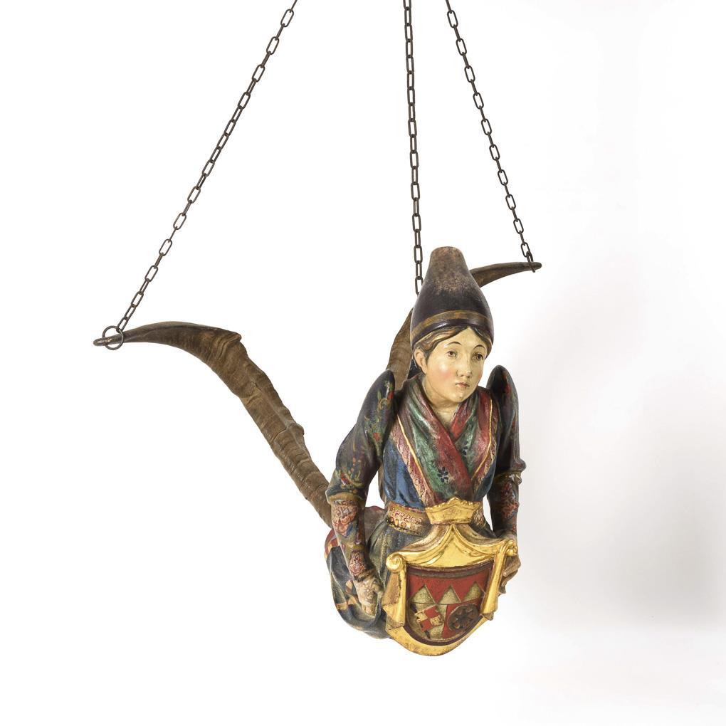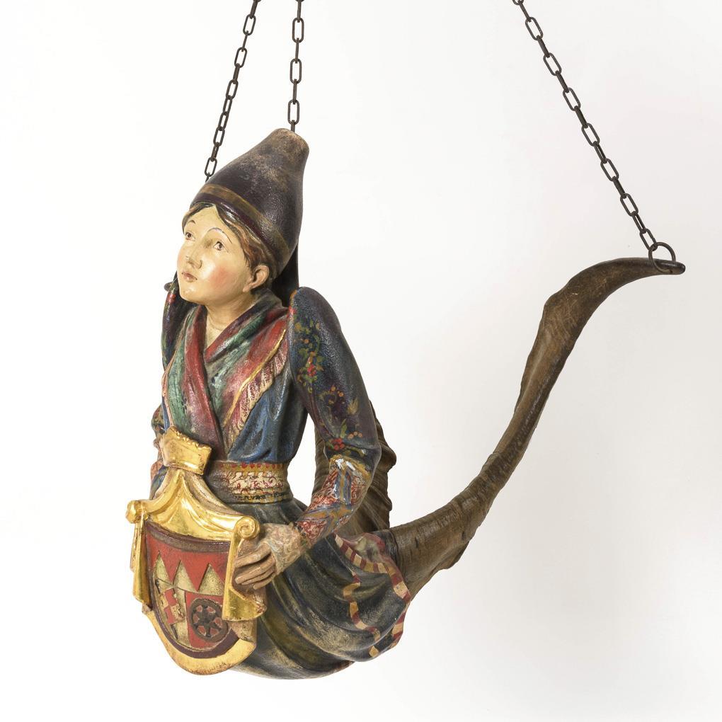 "Lüsterweibchen" in peasant costume with sheep horns instead of legs as well as coat of arms in front of the belly. 3-fold chain suspension. Horn base reglued.