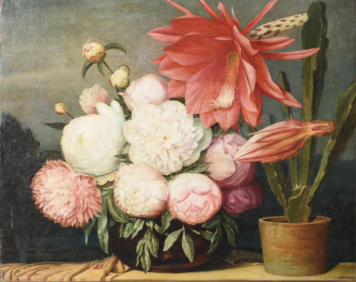 Blooming cactus next to a bouquet of peonies in flat vase on a ledge with landscape recognizable behind. Light traces of age.