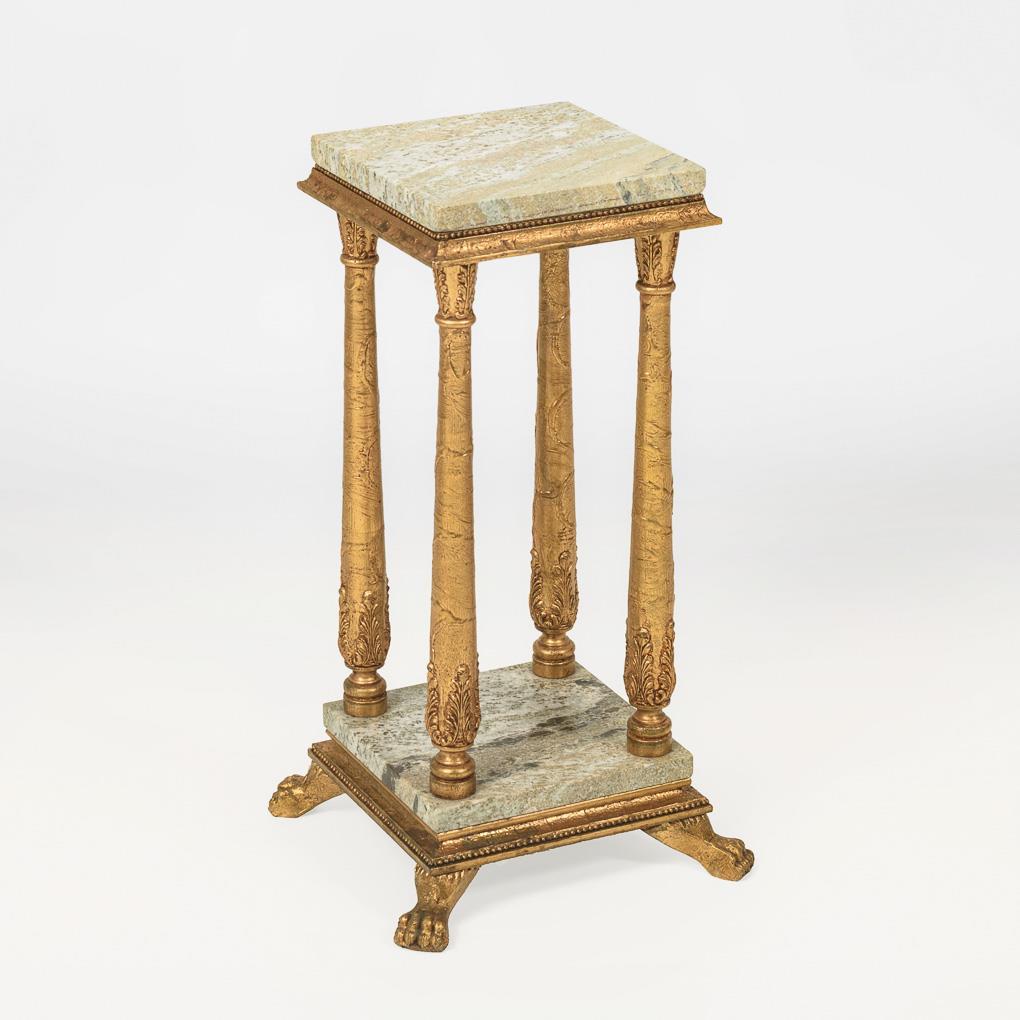 Stuccoed, gold-bronzed wood, grayish-green marble. H approx 65 cm, top plate: approx 24.5 x 24.5 cm.