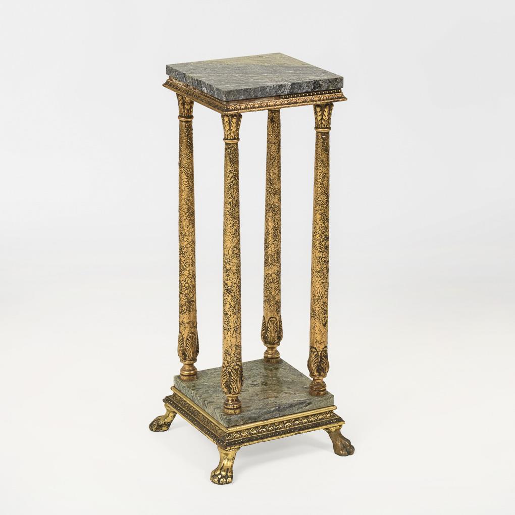 Stuccoed, gold-bronzed wood, grayish marble. H about 76.5 cm, top plate: about 25 x 25 cm.