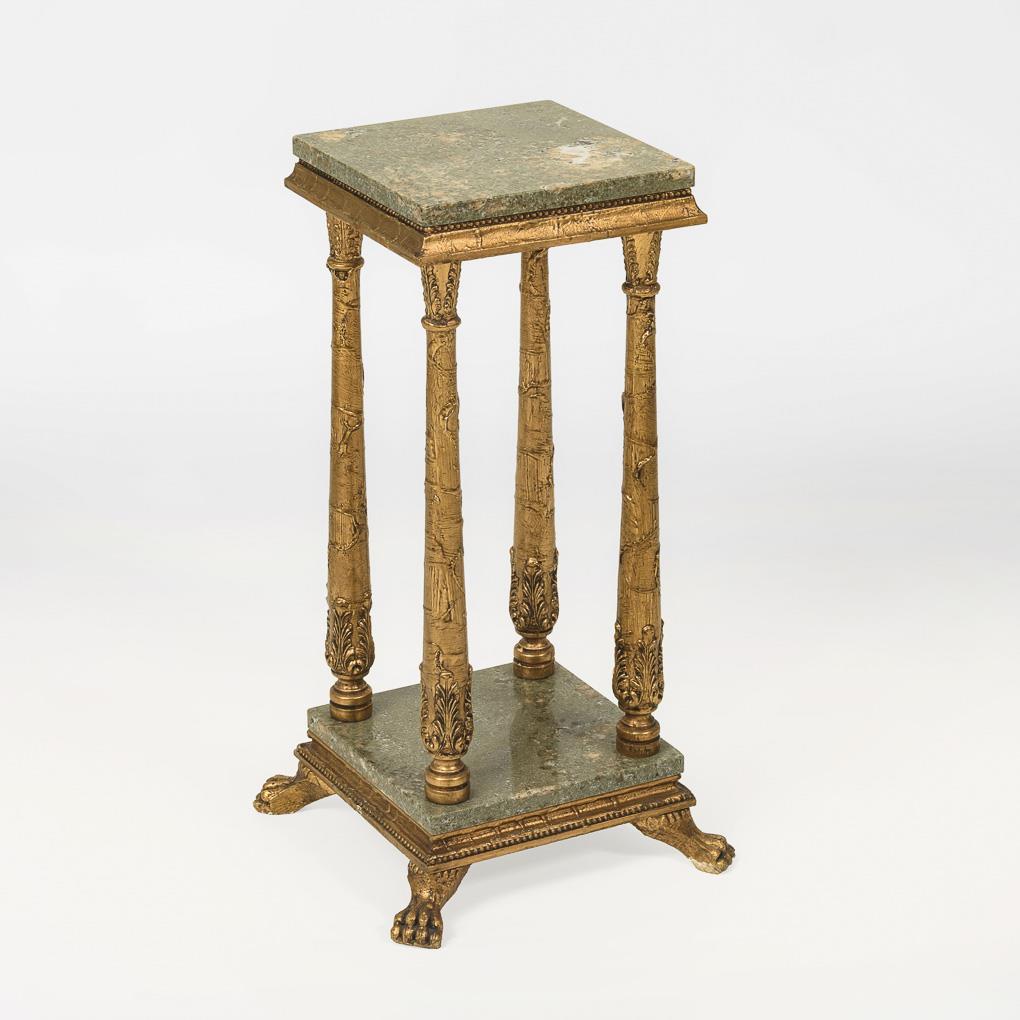 Stuccoed, gold-bronzed wood, grayish-green marble. H approx 64 cm, top plate: approx 24.5 x 24.5 cm.
