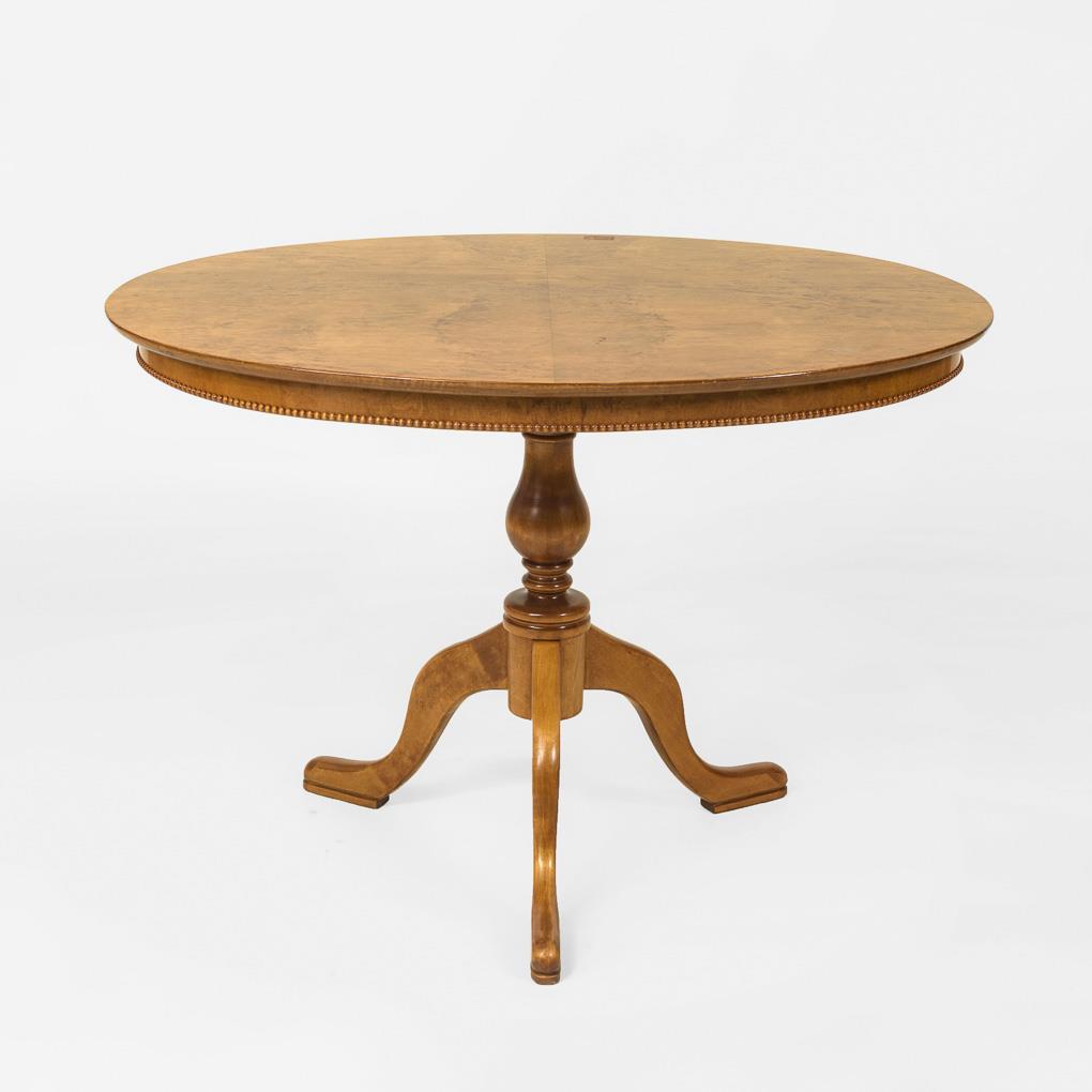 Oval table with baluster center support and 3 curved legs, frame decorated with surrounding pearl bar. Slight signs of age / use.
