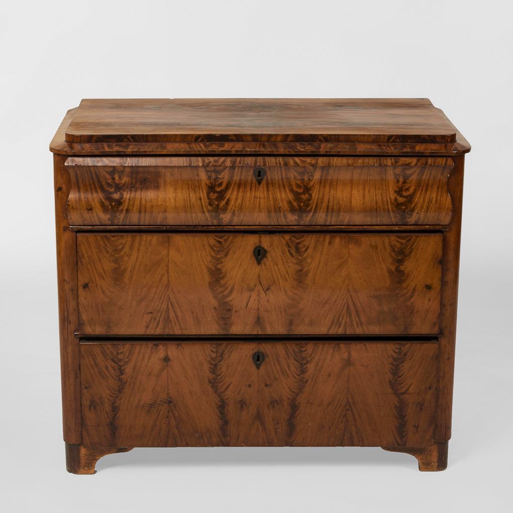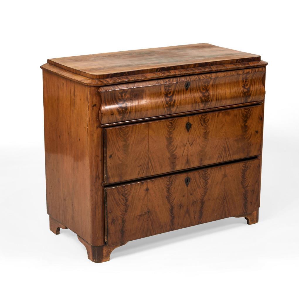 3-bay chest of drawers with concave arched head drawer; decorated with burl veneer. Traces of age/use, feet old supplemented.