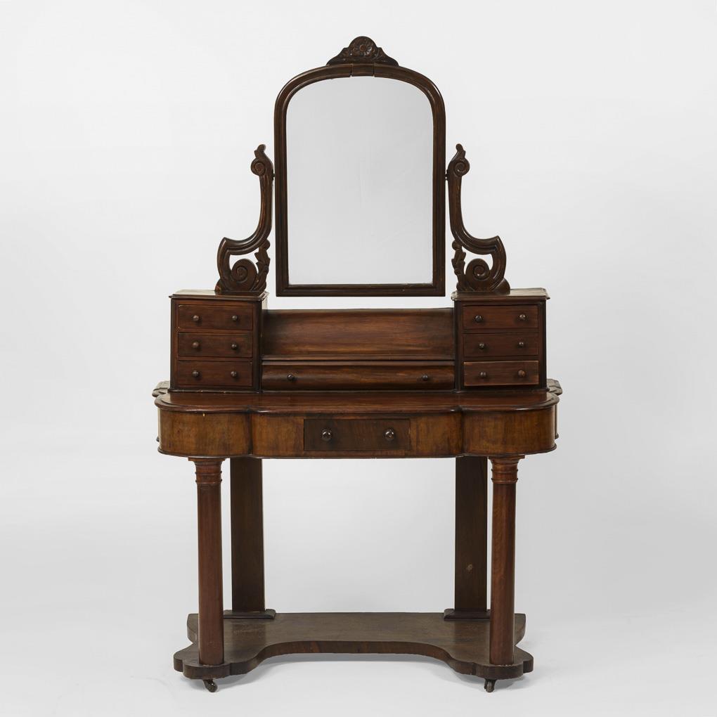 Elegant rolling dressing table with mirror top, 6 small drawers and 1 wide drawer, with discreet curved table top and frame drawer; on front column legs and footboard; accentuated decorated with volute mirror frame and floral finial. In need of restoration.