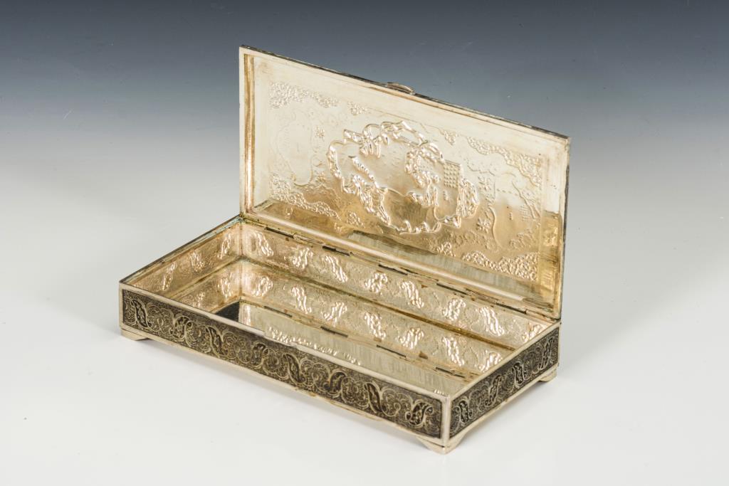 Dichte Rankengravur, auf dem Deckel figürliche (!) Darstellung. Gebrauchsspuren.