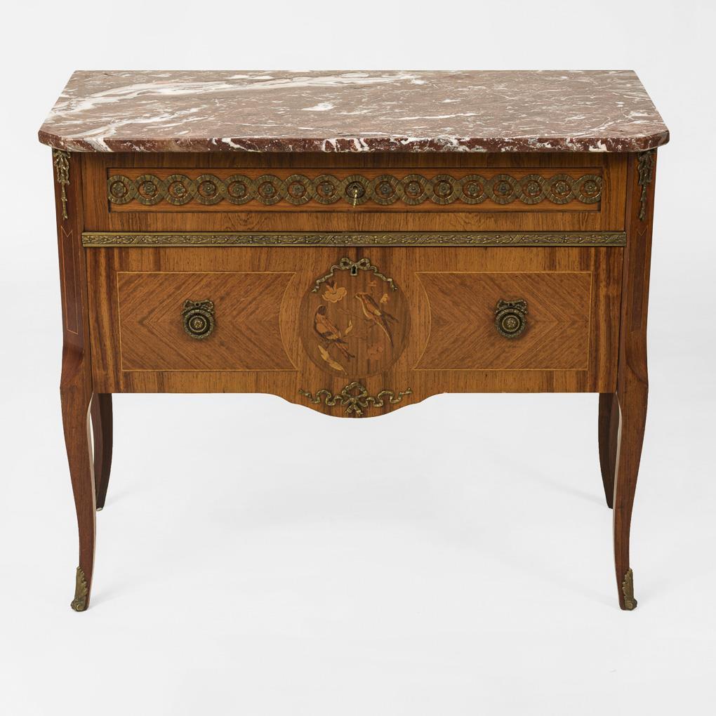 2-bay (1 narrow and 1 wide drawer), transitional-style chest of drawers on 4 slightly flared legs, with loosely resting reddish-gray marble top; lavishly decorated with bird marquetry and brass fittings. Slight signs of age/use.